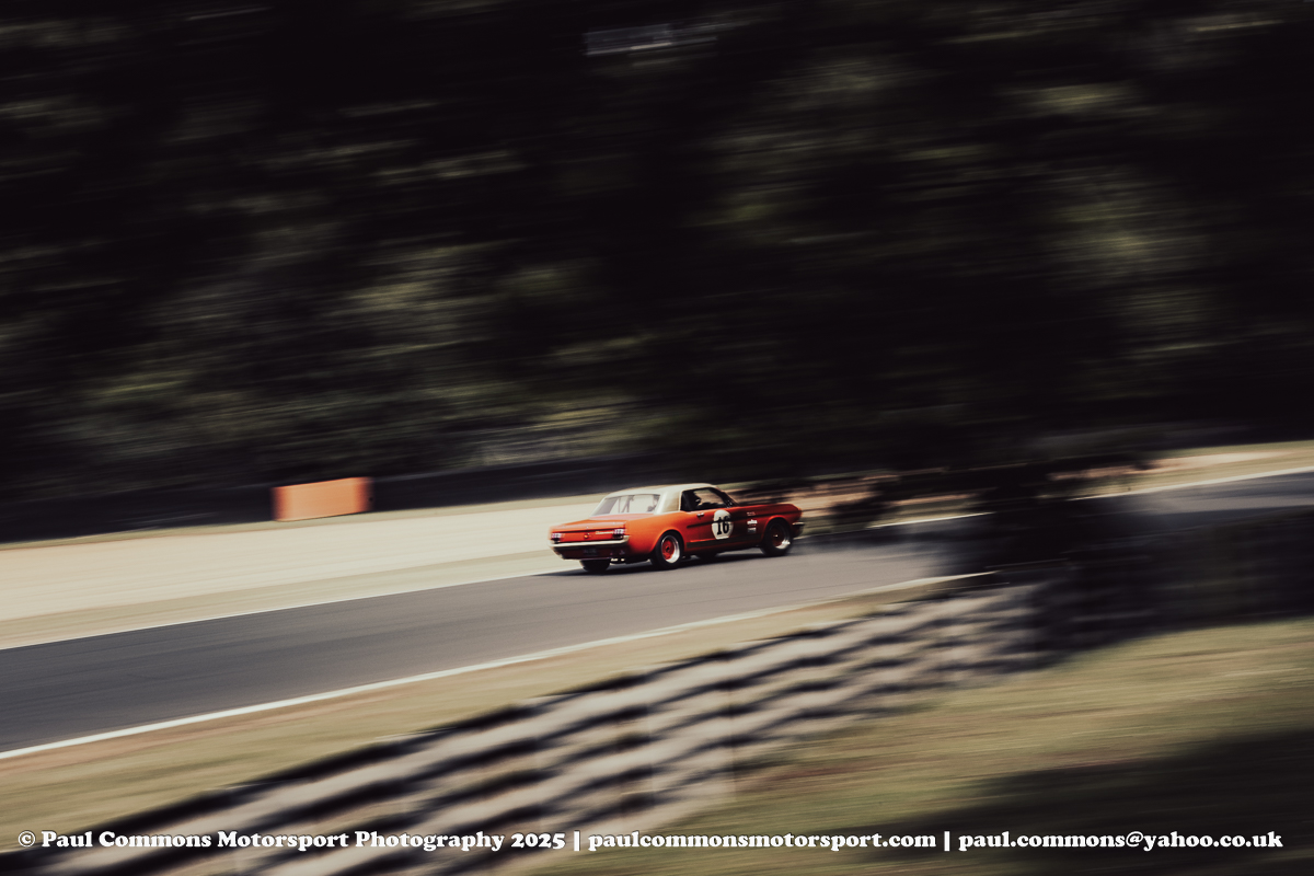 It was John Spiers who would start the event from pole in his Mustang however courtesy of a stunning lap from Nigel Greensall at the start of the day. Tom Sharp, aboard his Ford Falcon, would soon find himself in the lead though with another Mustang in the hands of Alex Taylor soon upto second before Spiers’ event was ruined courtesy of a nudge from behind which would see the pole sitter lose a significant amount of time in the Paddock Hill Bend gravel.