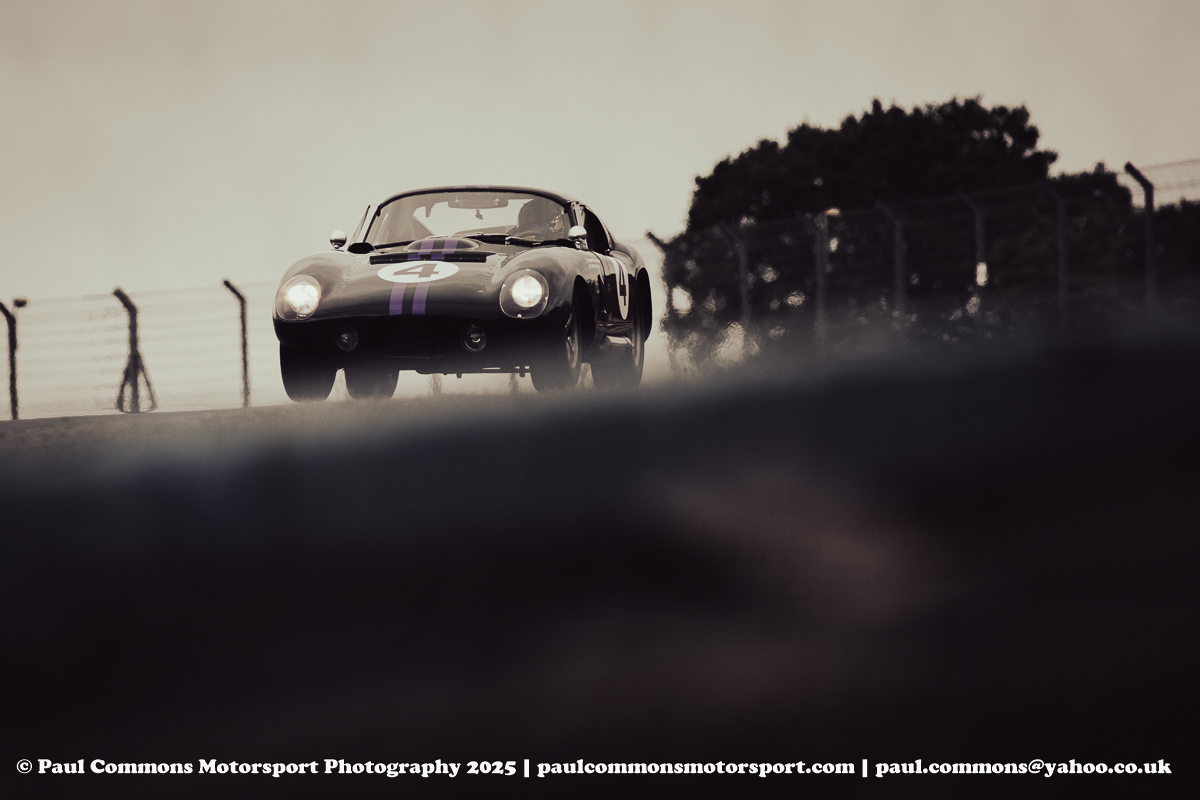 Chris Chiles Junior had earlier taken pole position aboard the family Shelby Cobra with an incredible 1.16.086, a whopping 1.8 seconds quicker than anyone else!  And, after a steady start in damp conditions would hit the front on lap 2 after fellow front row starter Kyle Tilley (Lotus 15) had been quicker out of the blocks.  John Spiers (Lister Knobbly) and Christian Albrecht (Jaguar E-Type) also started the race well with the latter soon past Spiers and Tilley to lie second before a safety car after just fifteen minutes of running would cause several crews to head to pit road.